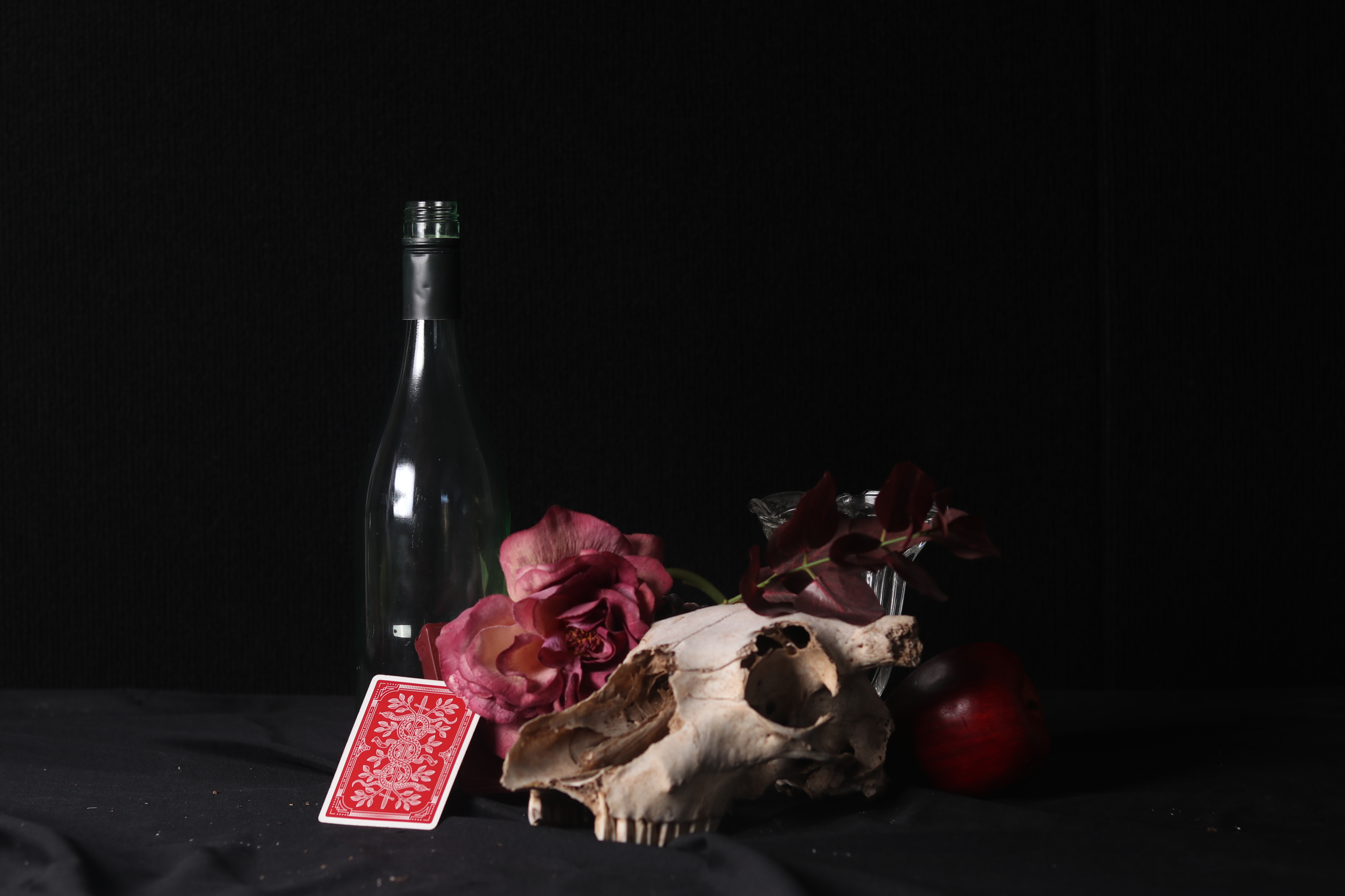 In this photo, the dark background represents the darkness and emptiness of death, which is then juxtaposed by lighting coming in from the left side. The skull and dead flower represent death and the ending of life which is then accentuated by the empty liquor bottle and playing card.